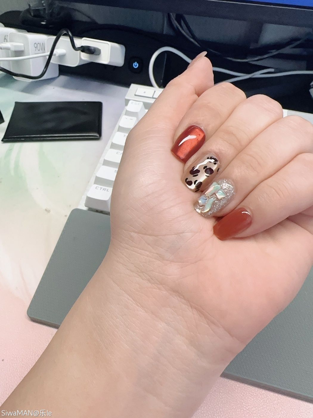 哇!这个美甲也太好看了吧!颜色搭配得特别温柔,而且边缘处理得好干净啊。你老婆手艺真不错,感觉都可以开美甲店了~